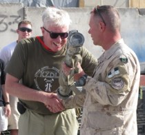 Canadian entertainer Bruce Cockburn was part of a group of entertainers who performed at a forward operating base in the Panjwaii district of Afghanistan on Thursday, Sept. 10, 2009. After Cockburn sung If I Had a Rocket Launcher Gen. Jonathan Vance jokingly presented him with a rocket launcher of his own.THE CANADIAN PRESS/Bill Graveland