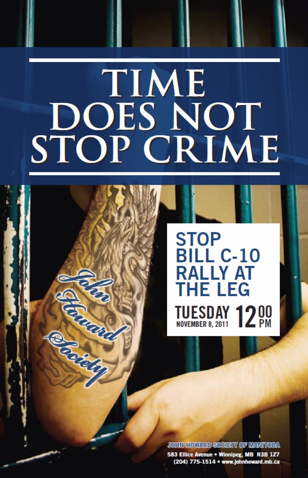 Nov. 8, 2011: 300 Winnipeggers demonstrated at the Manitoba Legislature and the Winnipeg Remand Centre to urge the Manitoba Government to join Quebec, Ontario and Newfoundland and Labrador in opposing the Harper government’s omnibus crime bill, misleadingly titled the Safe Streets and Communities Act (aka Bill C-10). Their key message, “time does not stop crime” rebutted the government’s contention that locking up more offenders for longer periods was an effective crime prevention technique.
