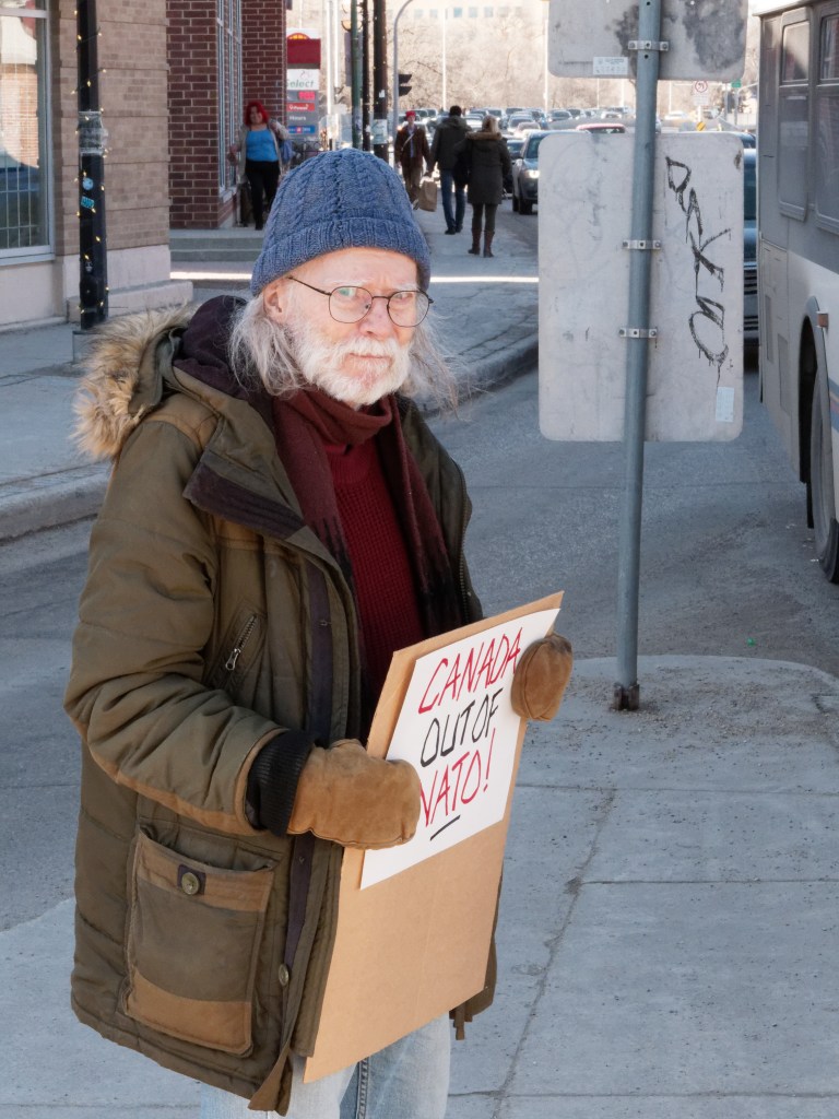 Winnipeg, April 4, 2024: Members of Peace Alliance Winnipeg marked the 75th anniversary of the founding of the North Atlantic Treaty Organization (NATO) with an information picket in the Osborne Villlage neighbourhood of Winnipeg. Photos and video by Paul S. Graham